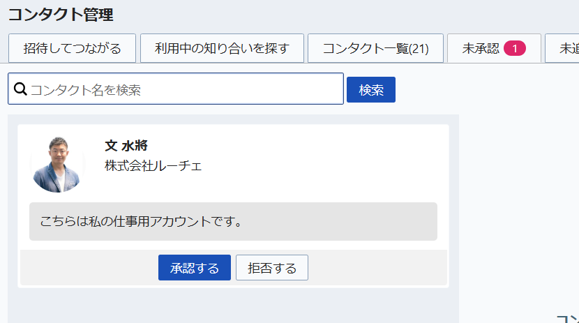 弊社代表の顔写真が悪用され、「こちらは私の仕事用アカウントです。」というメッセージと共にコンタクト申請が行われています。